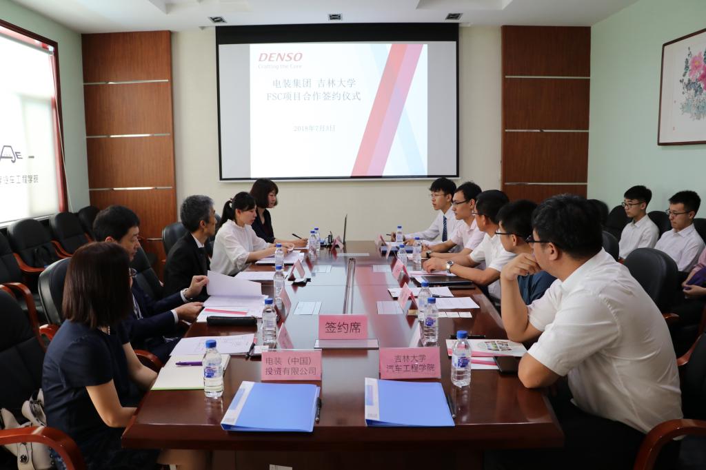 加藤本部长简述了电装集团的发展历程和核心理念,对吉速车队和电装集团在造物精神方面的统一性表示高度肯定,表达了对学院教育成果的赞扬,希望车队到日本参加FSJ比赛。车队队长王新宇简述了车队的成果和发展现状并对电装集团的支持表达了诚挚的感谢。随后,今年会jinnian官网党委书记李善兴和电装(中国)投资有限公司本部长加藤明弥共同签署了车队资助协议。双方将从交流科技创新,提升人才培养质量方面开展合作。电装公司将为今年会jinnian官网吉速车队提供24万元人民币的资金支持以及相关技术、设备支撑,在零部件采购加工等方面为车队提供便利条件,致力于帮助吉速车队在中国大学生方程式大赛上取得更加优异的成绩。