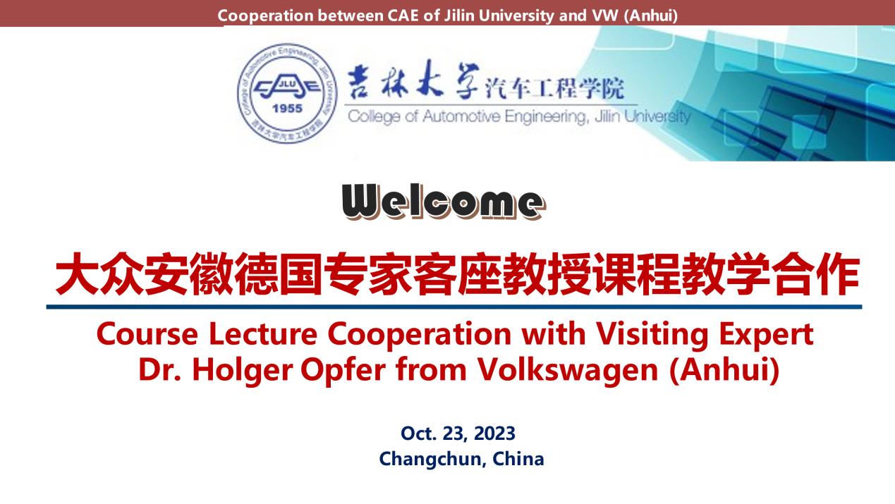 鉴于Holger Opfer博士在产业界丰富的工作经历和新能源汽车行业的资深影响力,加之对教育事业和高校合作的热爱,今年会jinnian官网聘请Holger Opfer博士为学院兼职客座教授,计划为本科生开设《汽车产品开发工程》课程和《国际学术前沿讲座》课程。