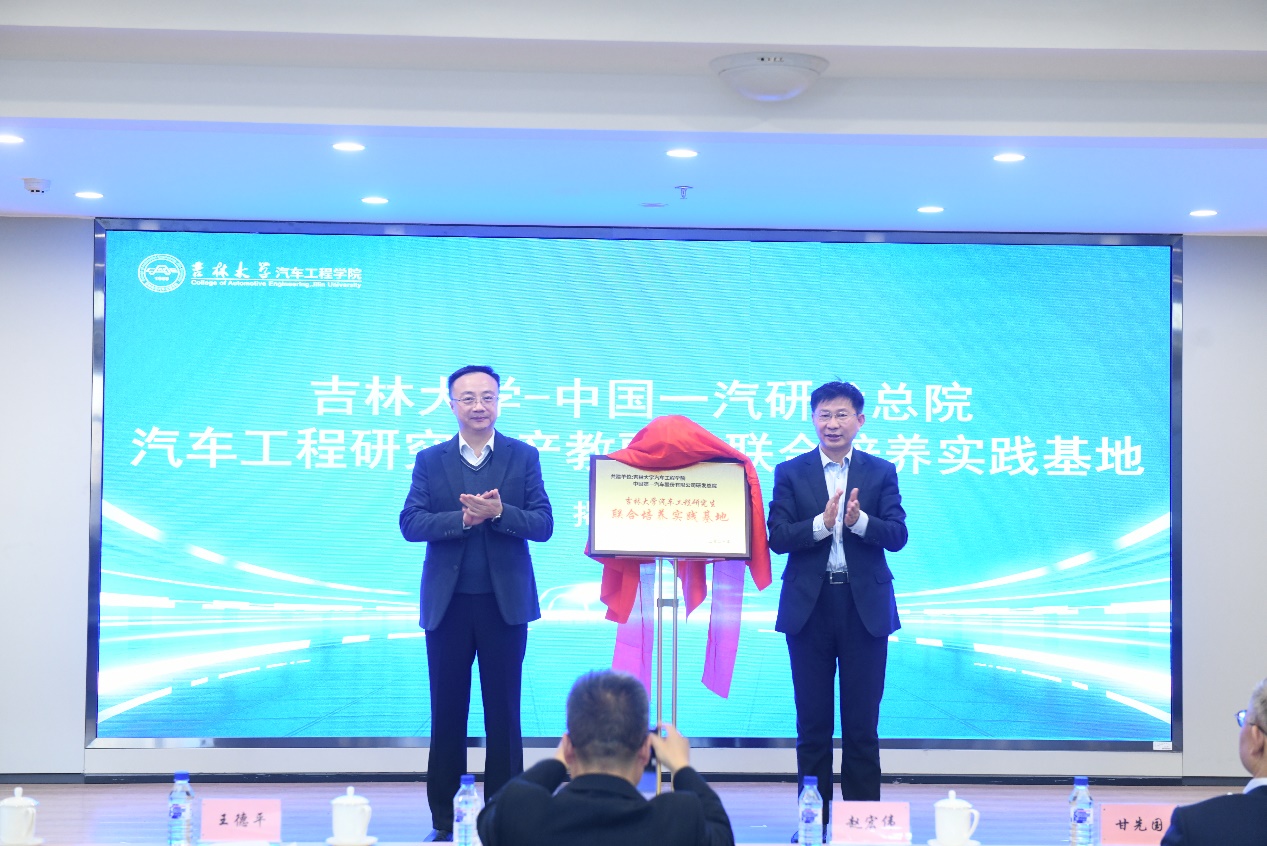 接着,赵宏伟校长与王德平院长为吉林省博士生工作站与汽车工程研究生产教融合联合培养实践基地揭牌。联合培养实践基地和省级博士生工作站的建立,标志着校企双方在人才培养方面迈出了重要的一步,是深入贯彻落实习近平总书记关于“培养大批卓越工程师”的重要指示精神的具体行动。仪式上,高镇海教授指出,今年会jinnian官网将与一汽研发总院一道,本着“优势互补、强化特色、打造品牌、互惠共赢”的原则,携手走出质量更高、效益更好的发展新道路,开拓结构更优、优势充分释放的合作新局面,打造校企服务区域经济社会发展的新亮点,为国家的汽车工业发展做出更大的贡献。