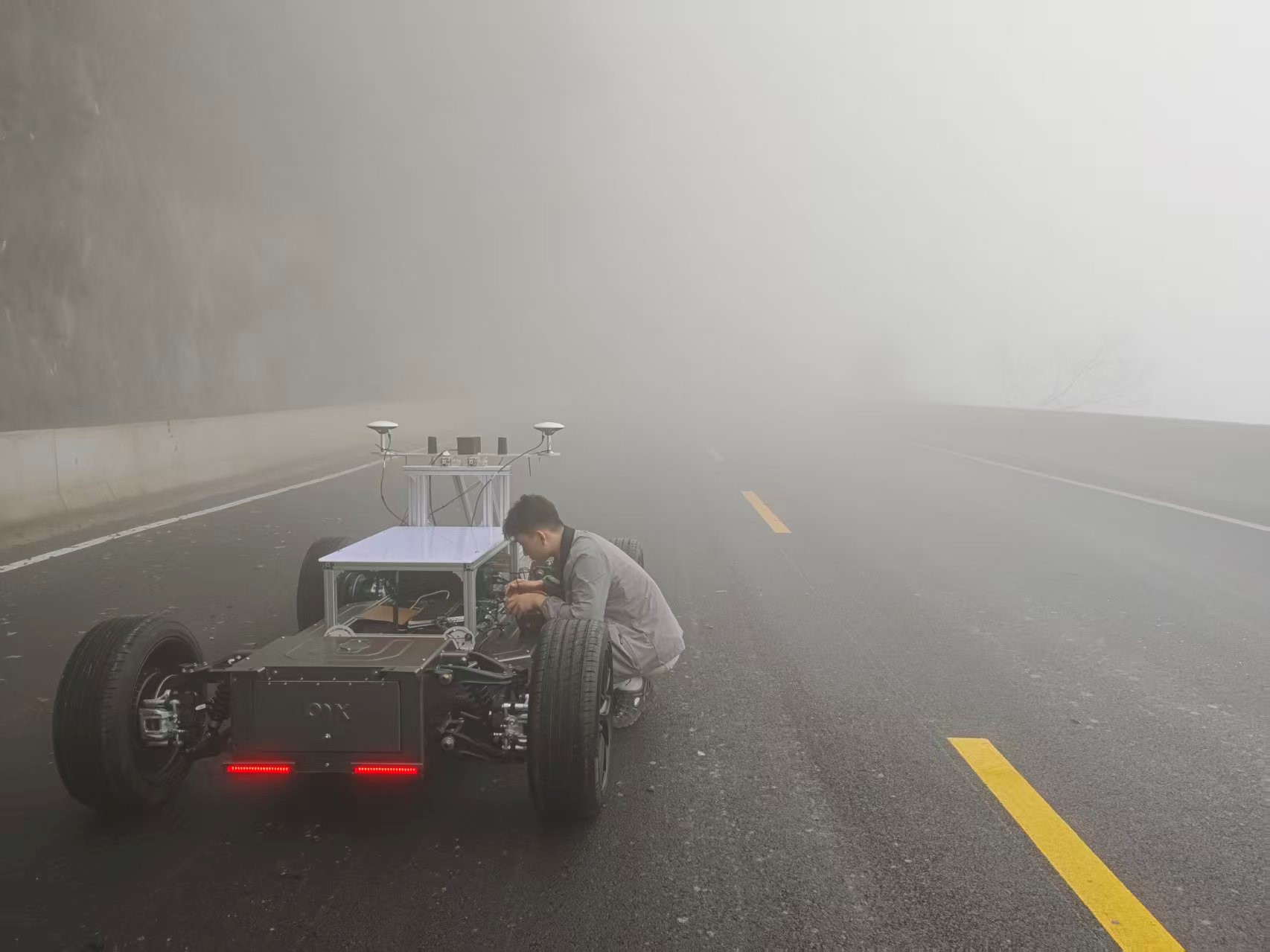 我校智翼人工智能战队相比其他战队获得会务组提供的线控底盘相对较晚,为抢出更多的调试时间,队员们克服种种困难、每日最早到达赛场且最晚离开,在天门山脚下的雨棚中完成了底盘调试与各类传感器的安装。队员们紧锣密鼓地开发并调试建图、定位、规划与控制算法,成为第2支率先通过资格认证的队伍。