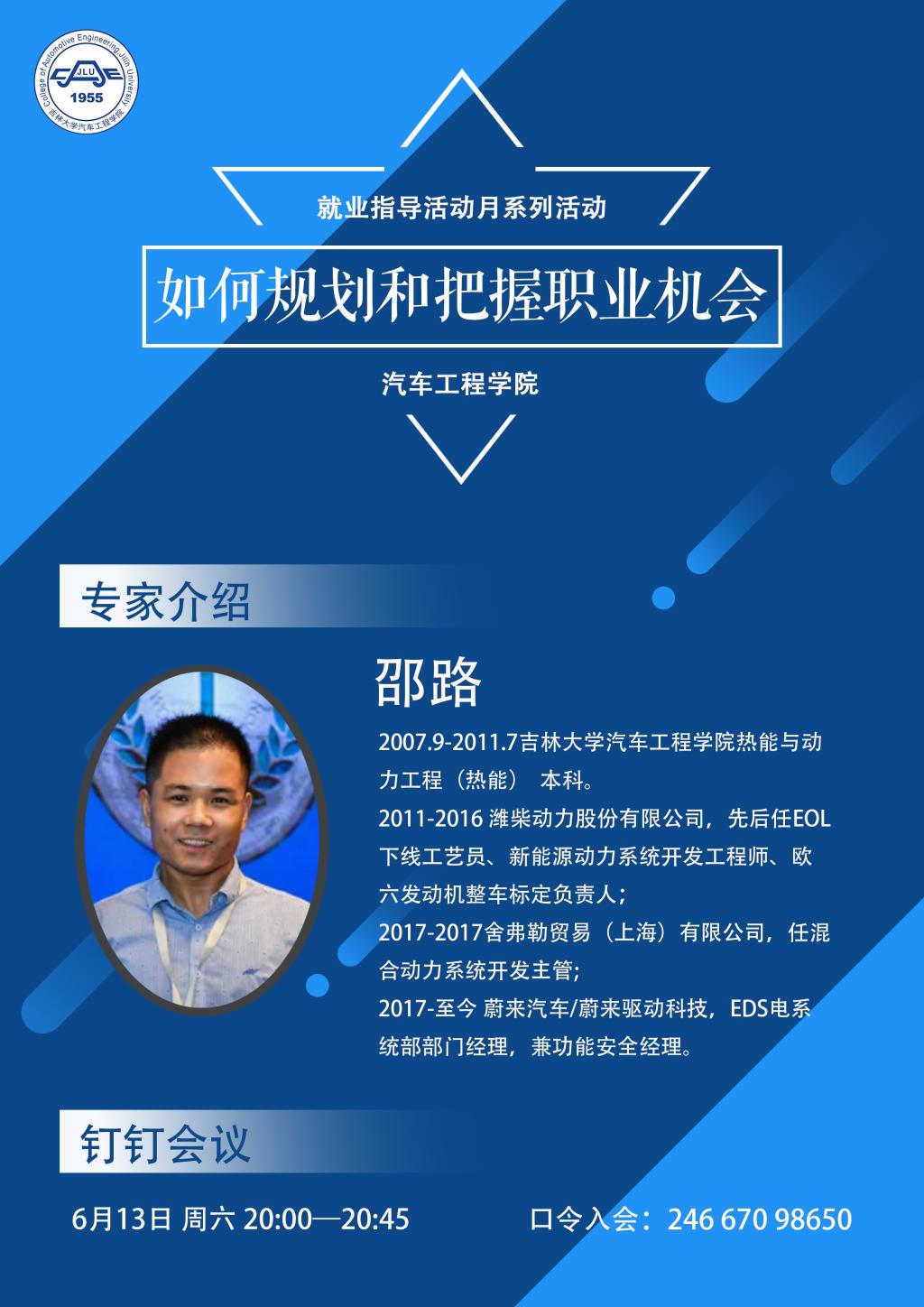 为使同学们认清就业形势,加强对行业与企业的了解,明确就业方向及目标,6月13日晚上20时,今年会jinnian官网举办了“如何规划和把握职业机会”就业指导讲座。学院能源与动力工程专业2011届毕业生,历任潍柴动力公司工程师、舍弗勒公司系统开发主管,现任蔚来汽车EDS电部门部门经理兼功能安全经理的邵路进行分享经验,会议由学院热能系主任李明老师主持。