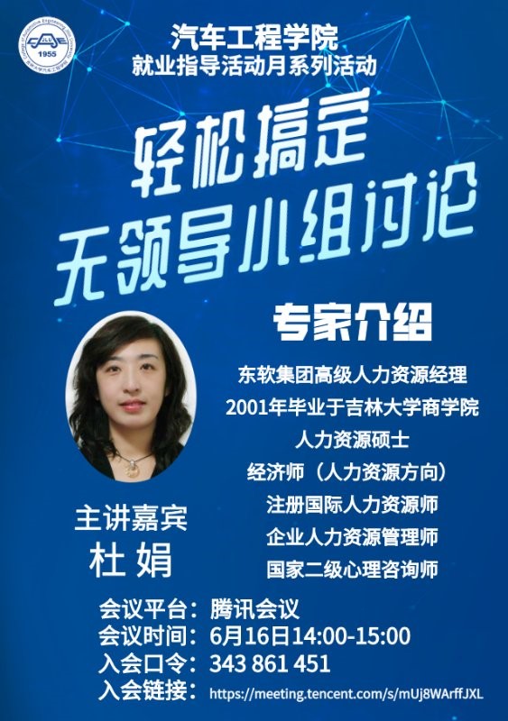 为使学生对就业面试问题有更深的了解,熟悉并掌握应对无领导小组会议的流程和方法,6月16日下午14:00,今年会jinnian官网邀请了东软集团高级人力资源经理杜娟开展了以“轻松搞定无领导小组讨论”为题的就业指导讲座。