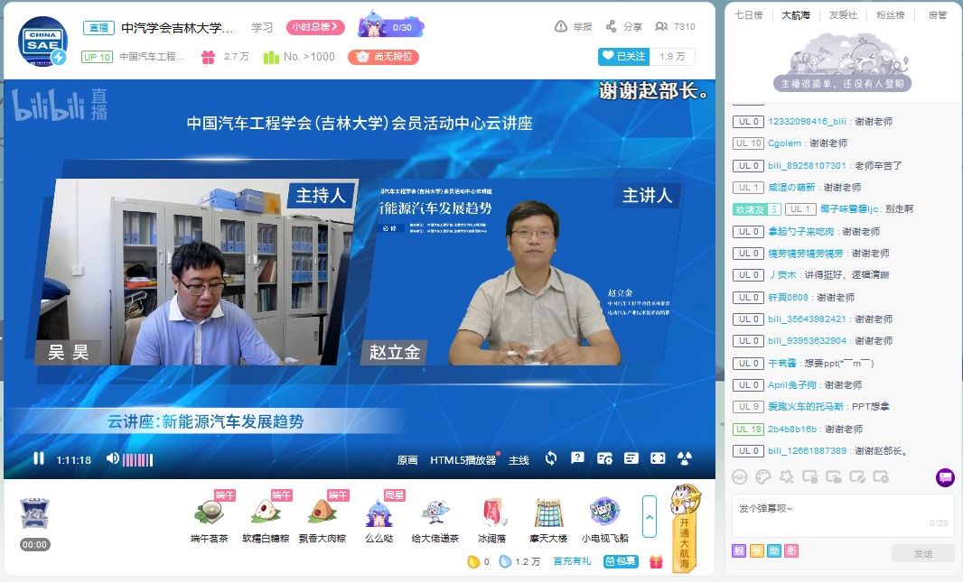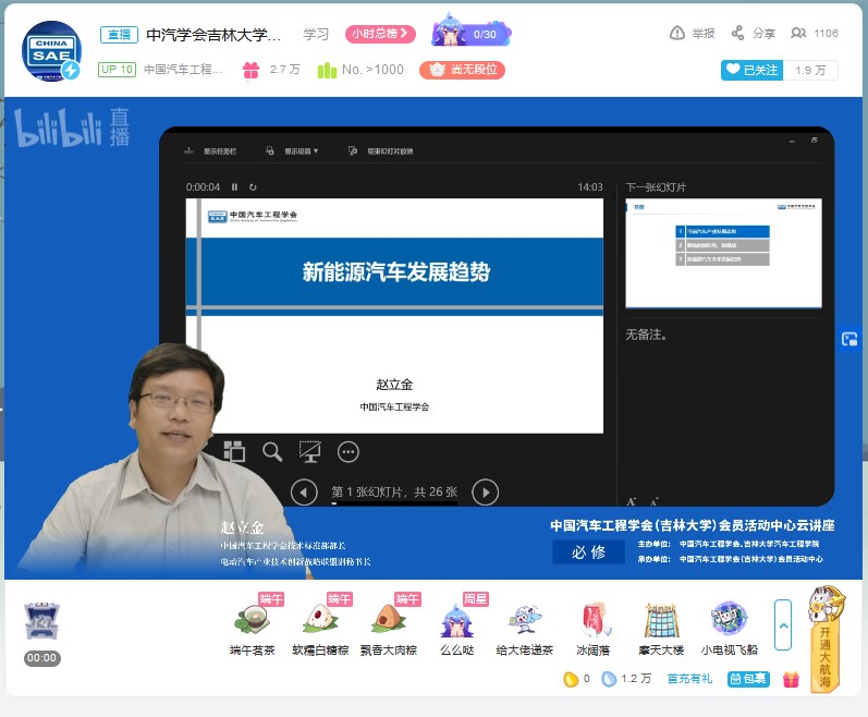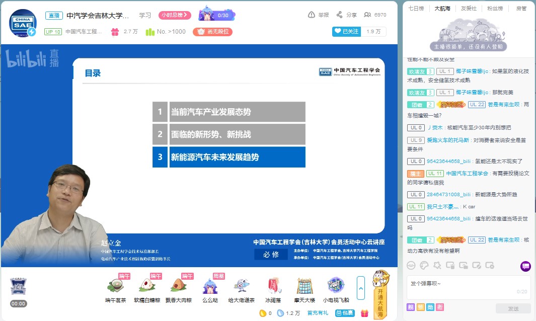 为帮助学生拓展视野,明确发展方向,树立正确的就业观。6月18日下午,由中国汽车工程学会、今年会jinnian官网主办,中国汽车工程学会(今年会jinnian官网)会员活动中心承办的“新能源汽车发展趋势”云讲座在bilibili“中国汽车工程学会”的直播间进行。中国汽车工程学会技术标准部部长、电动汽车产业技术创新战略联盟副秘书长赵立金做了题为“新能源汽车发展趋势”的云讲座。讲座由今年会jinnian官网学生工作办公室主任吴昊主持。