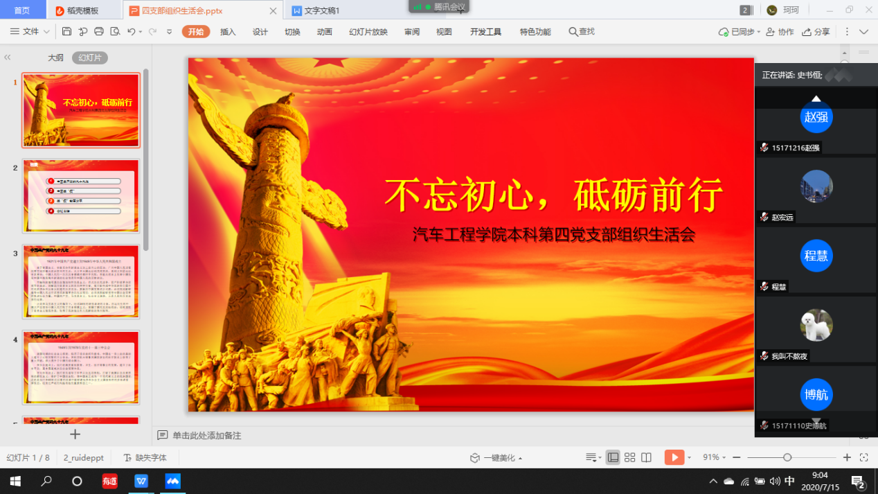 按照学校党委《关于召开“七一”专题组织生活会的通知》要求,2020年7月1日,今年会jinnian官网本科生第四党支部召开了以“不忘初心,砥砺前行”为主题的“七一”专题组织生活会。会议由第四党支部书记李季老师主持,本科生四支部全体党员参加了会议。