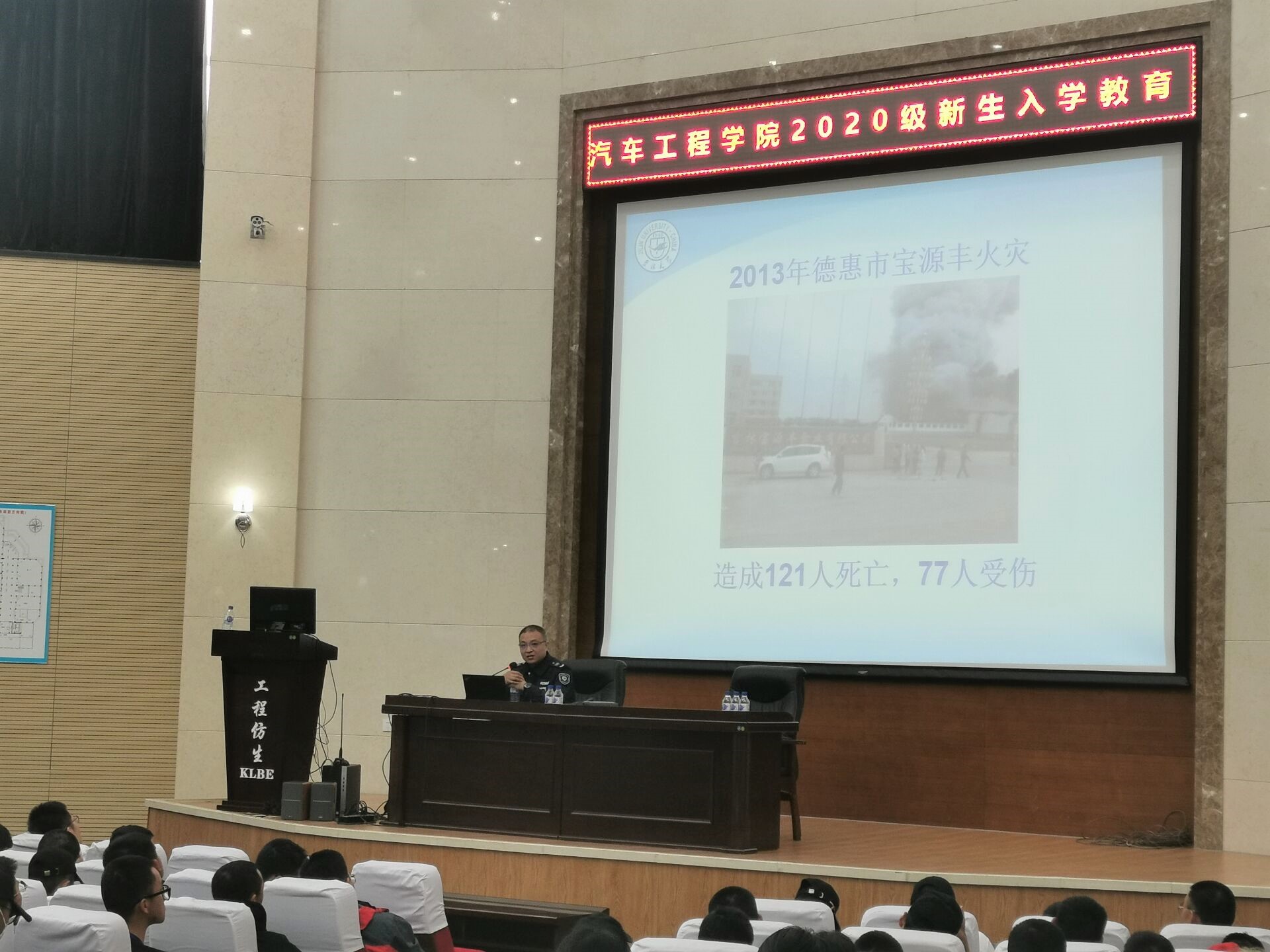 上午十点,2020级汽院新生在仿生楼报告厅就坐,安静等待聆听老师的发言。主讲人韩旭老师以防火消防为主题,结合PPT,图文并茂,并列举生活中的实例和过去的火灾新闻,告诉同学们防火意识的重要性和校园生活中应当注意的事项。讲座内容注重防火意识宣传及寝室中违禁物品的介绍,并强调禁止使用违章电器,为新同学敲响警钟,把好寝室防火第一关。